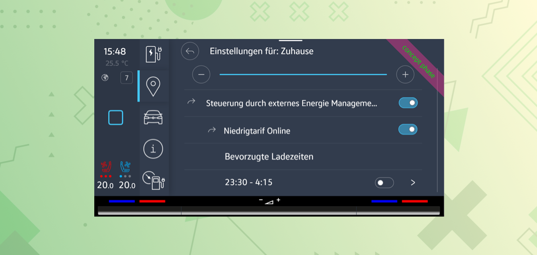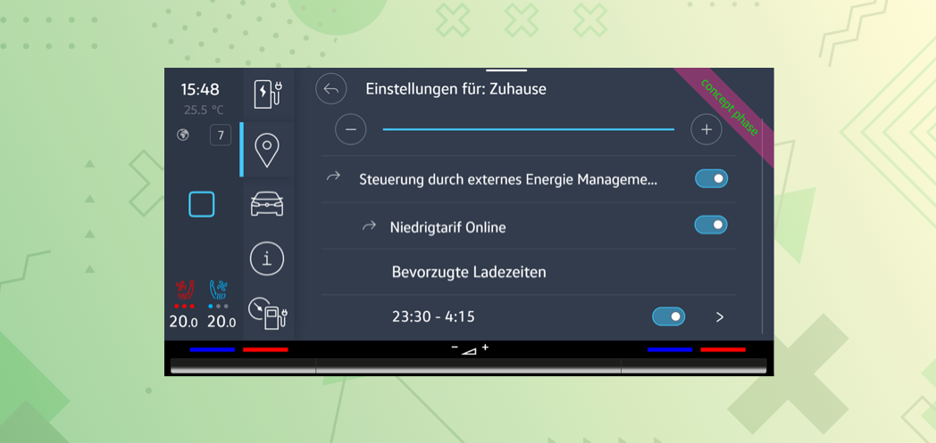 When the external energy management control is turned ON, the vehicle obtains the price for charging from external source and can be charged automatically at a set time.