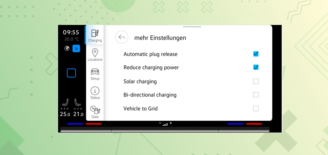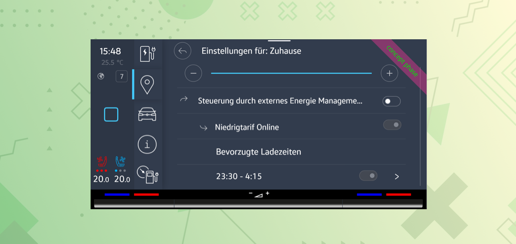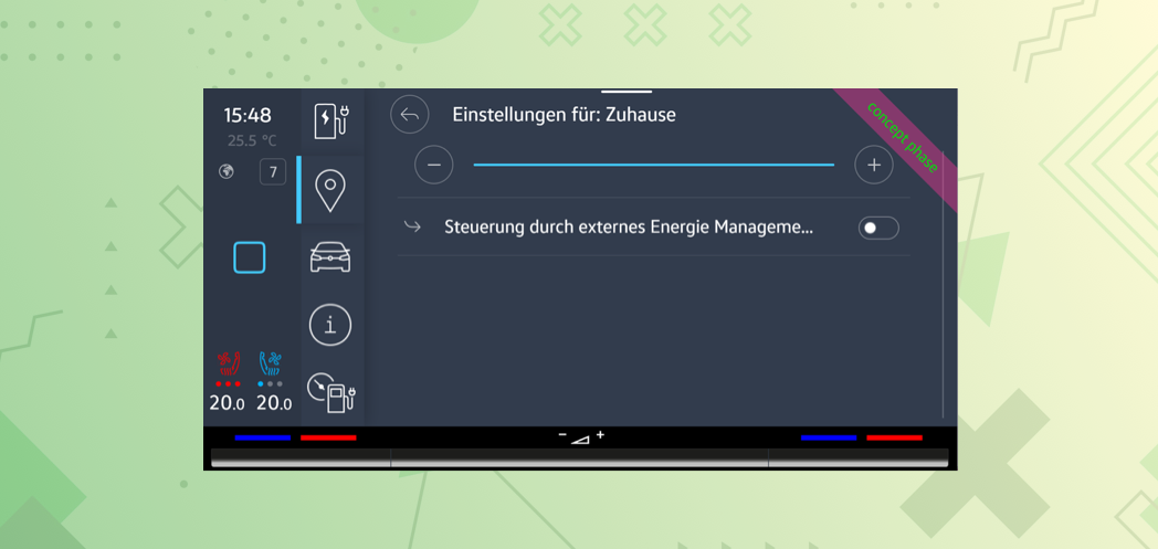 Control through external energy management is OFF. This means the user has to manually charge the vehicle.