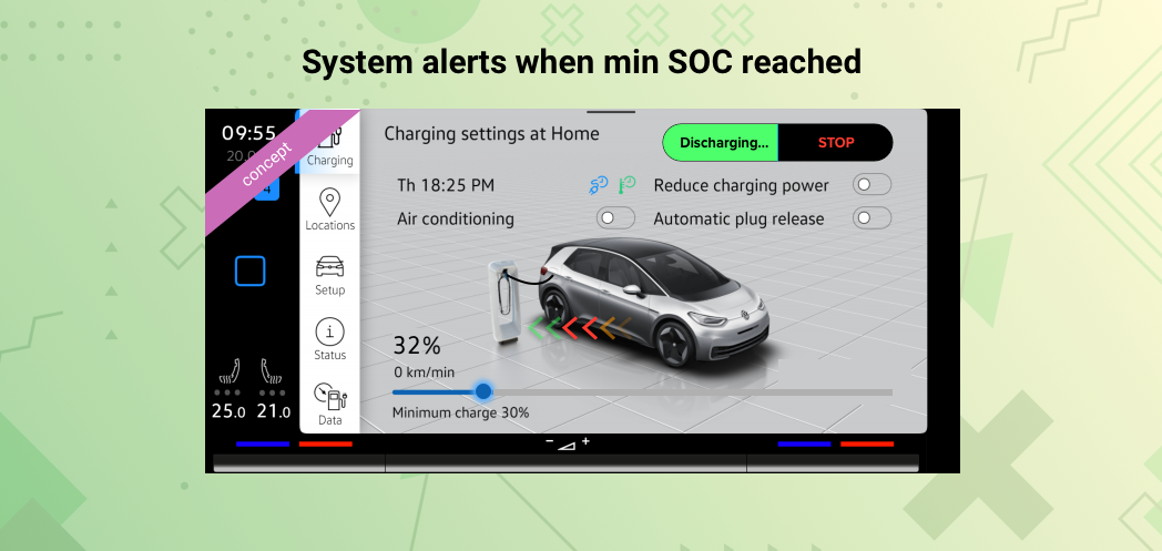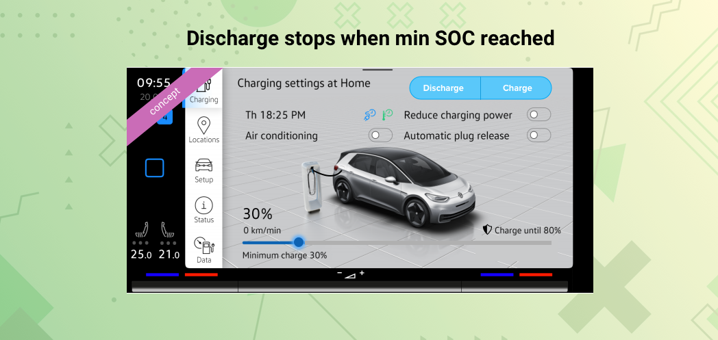The discharge during Bi-directional charging is interrupted either when EV reaches a min SOC or when it is