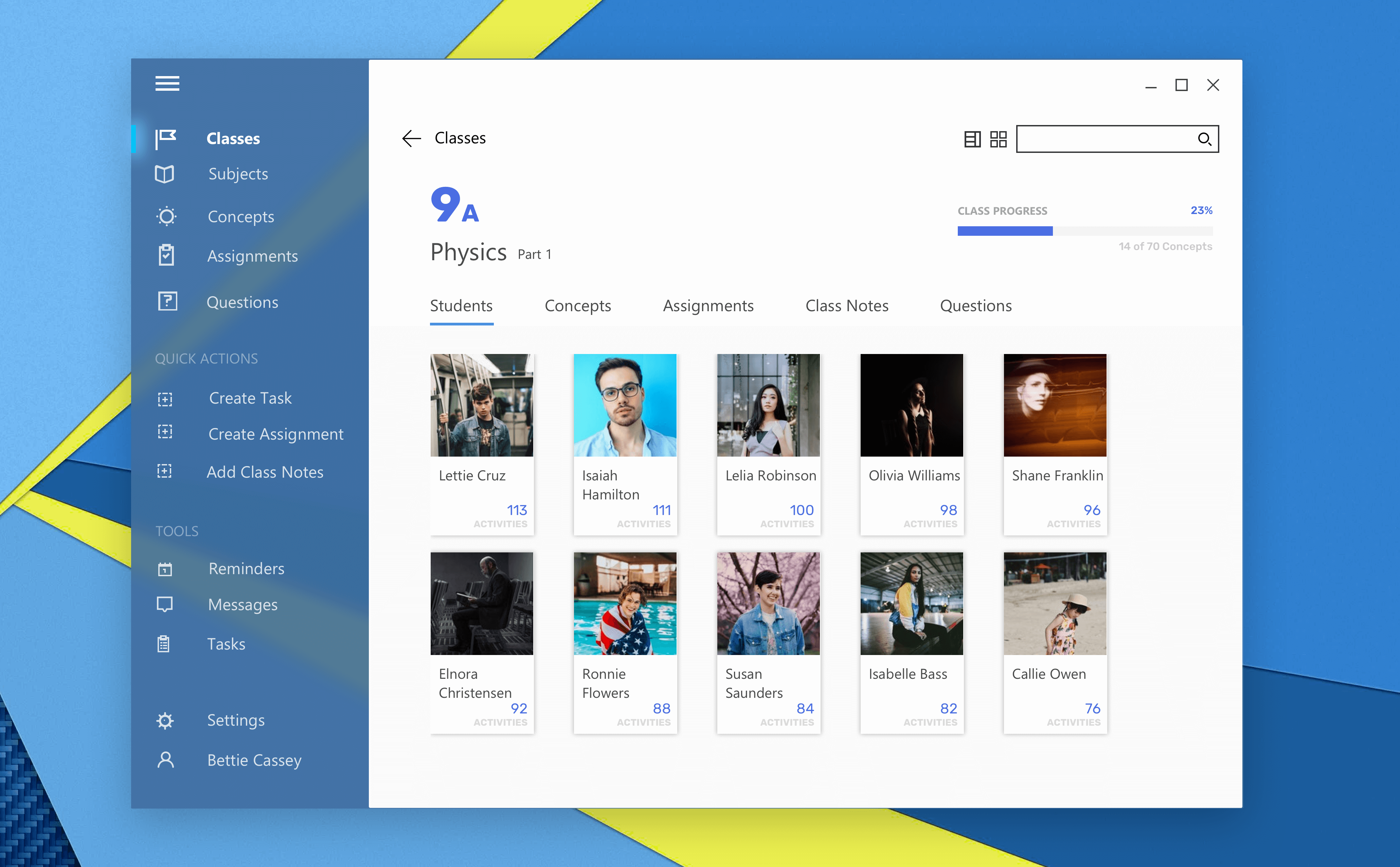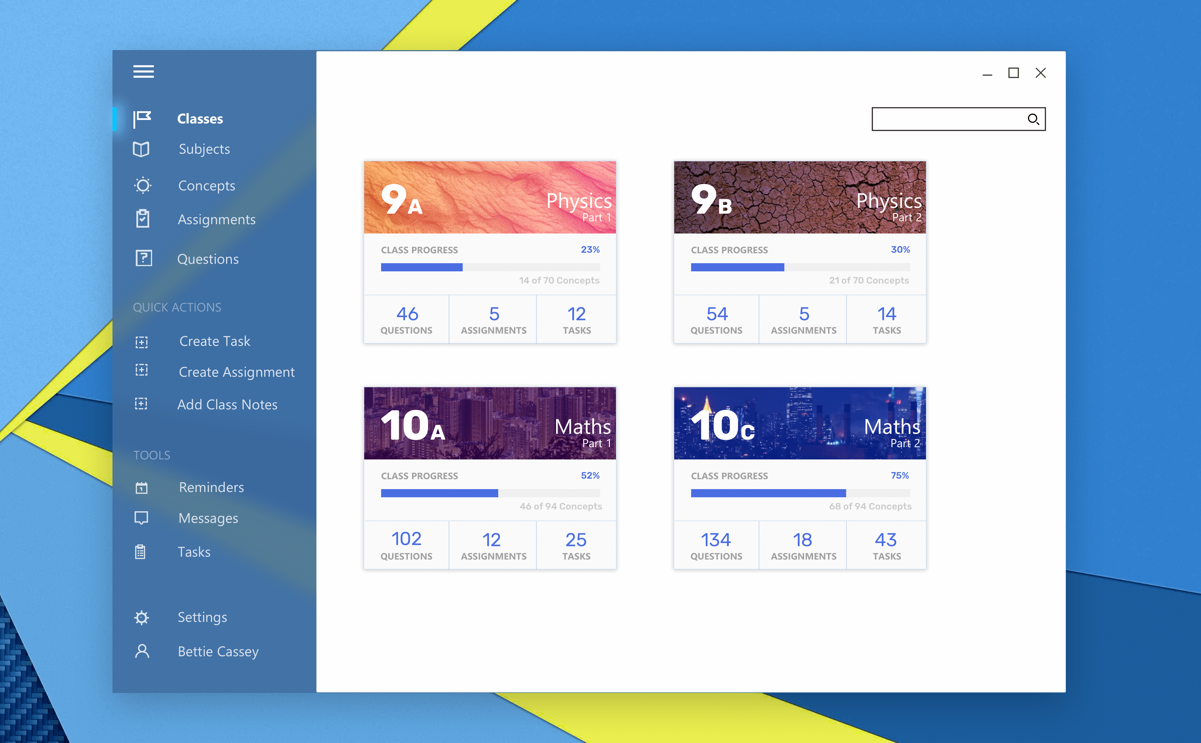 Each “Class-Card” has a progress of how many concepts are taught.