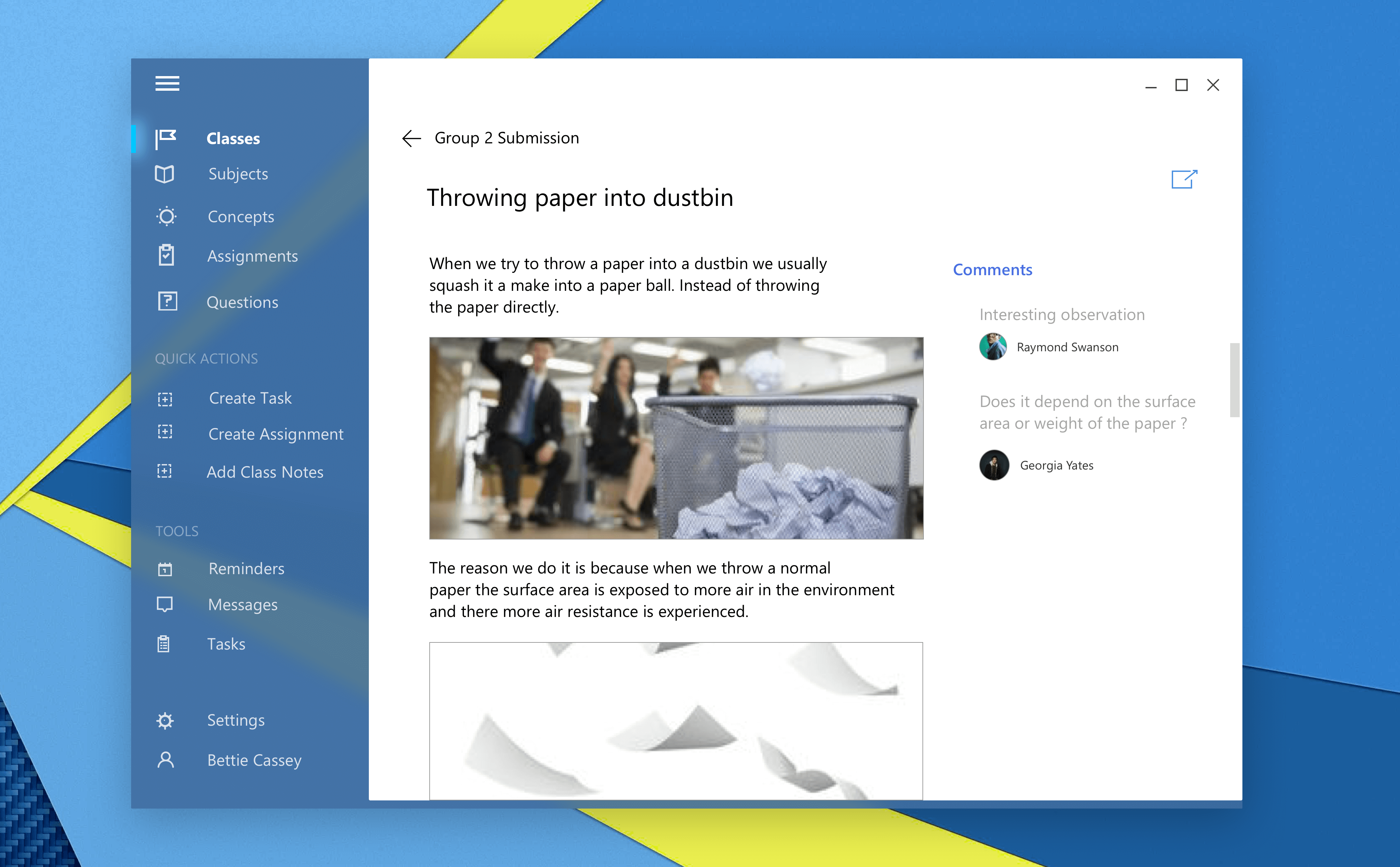 Teacher view of the student’s submission. Students can also view each other’s submission unless the teacher has made an assignment specifically hidden. This way, students can give feedback easily and help each other, understand the concepts well.
