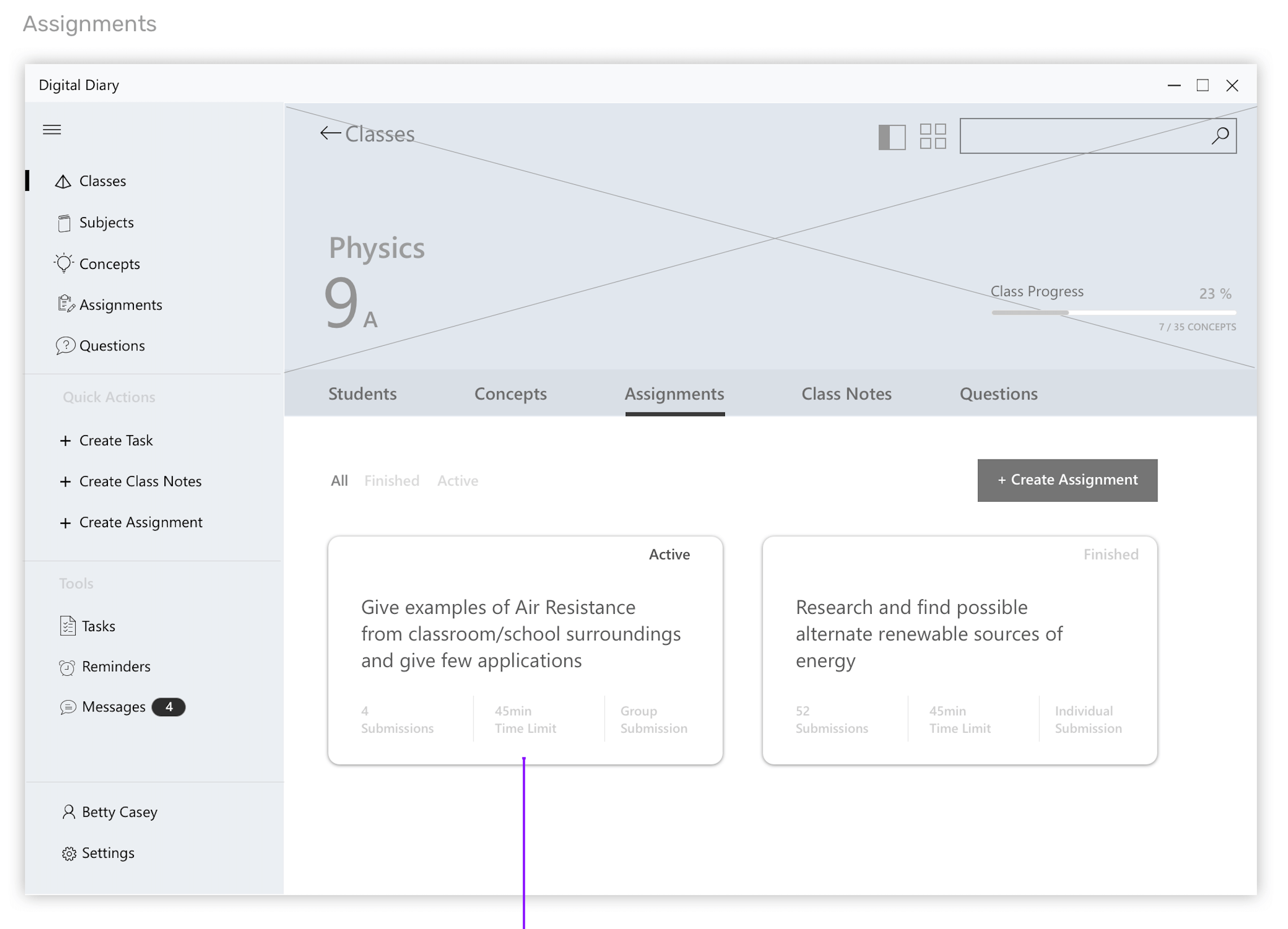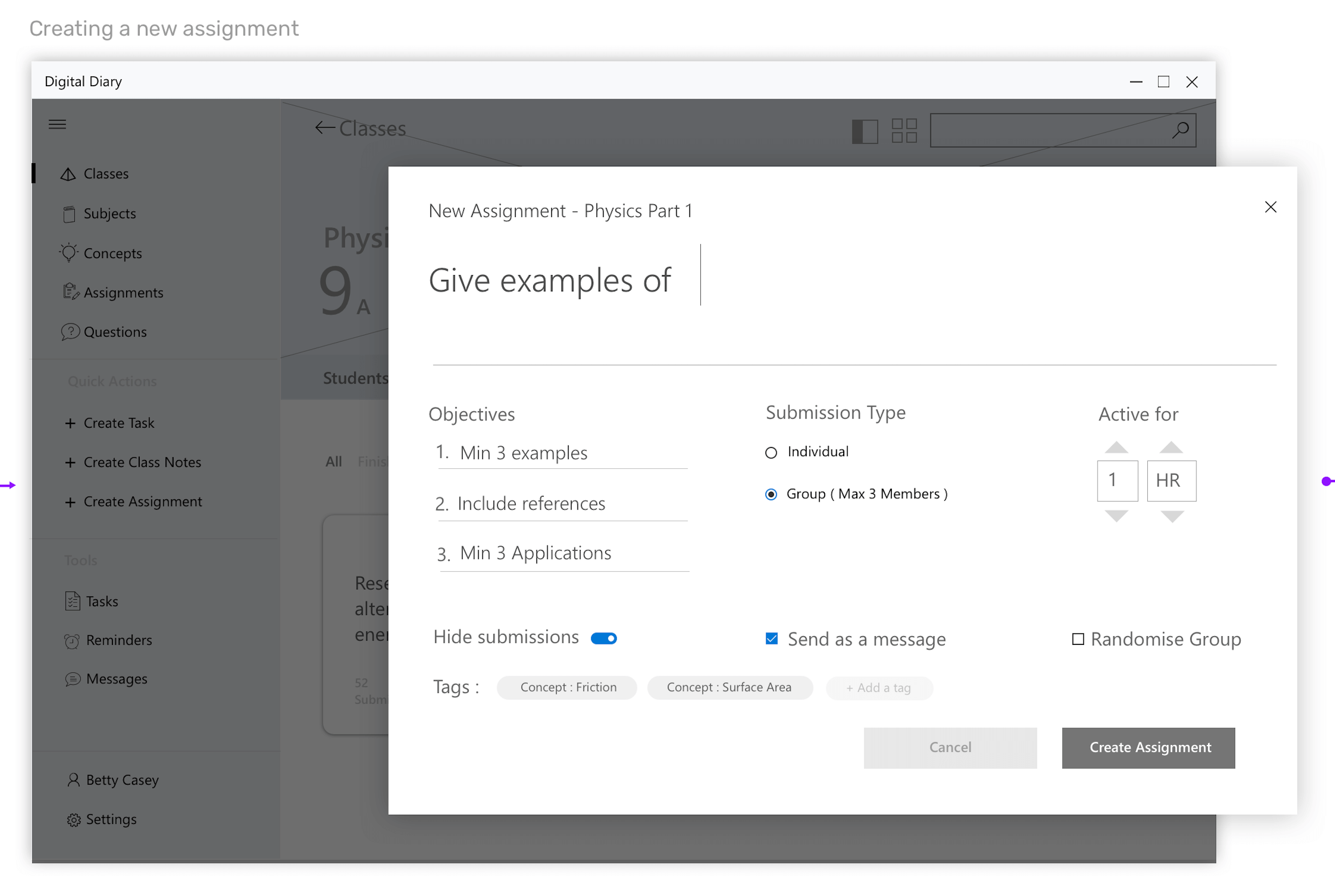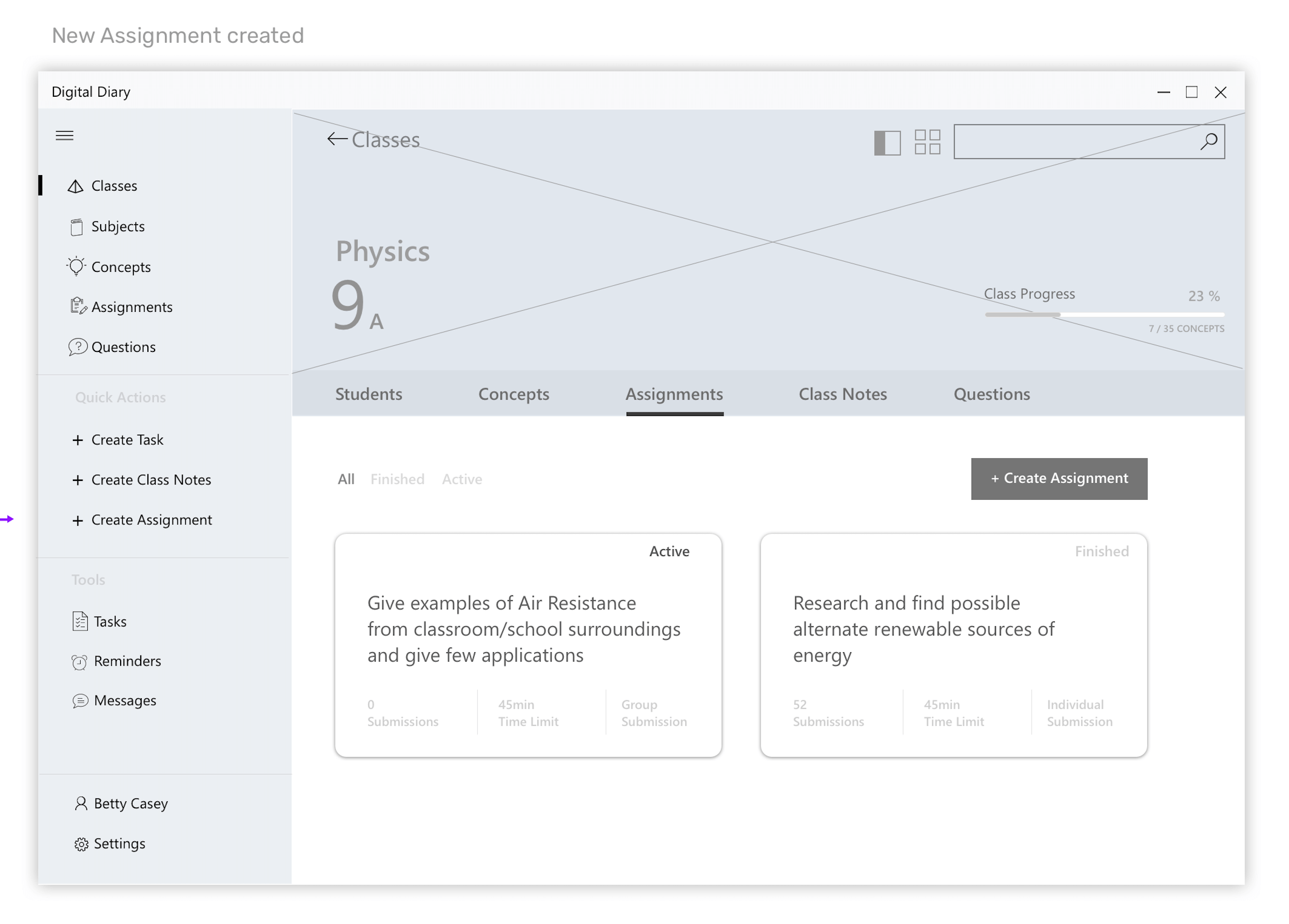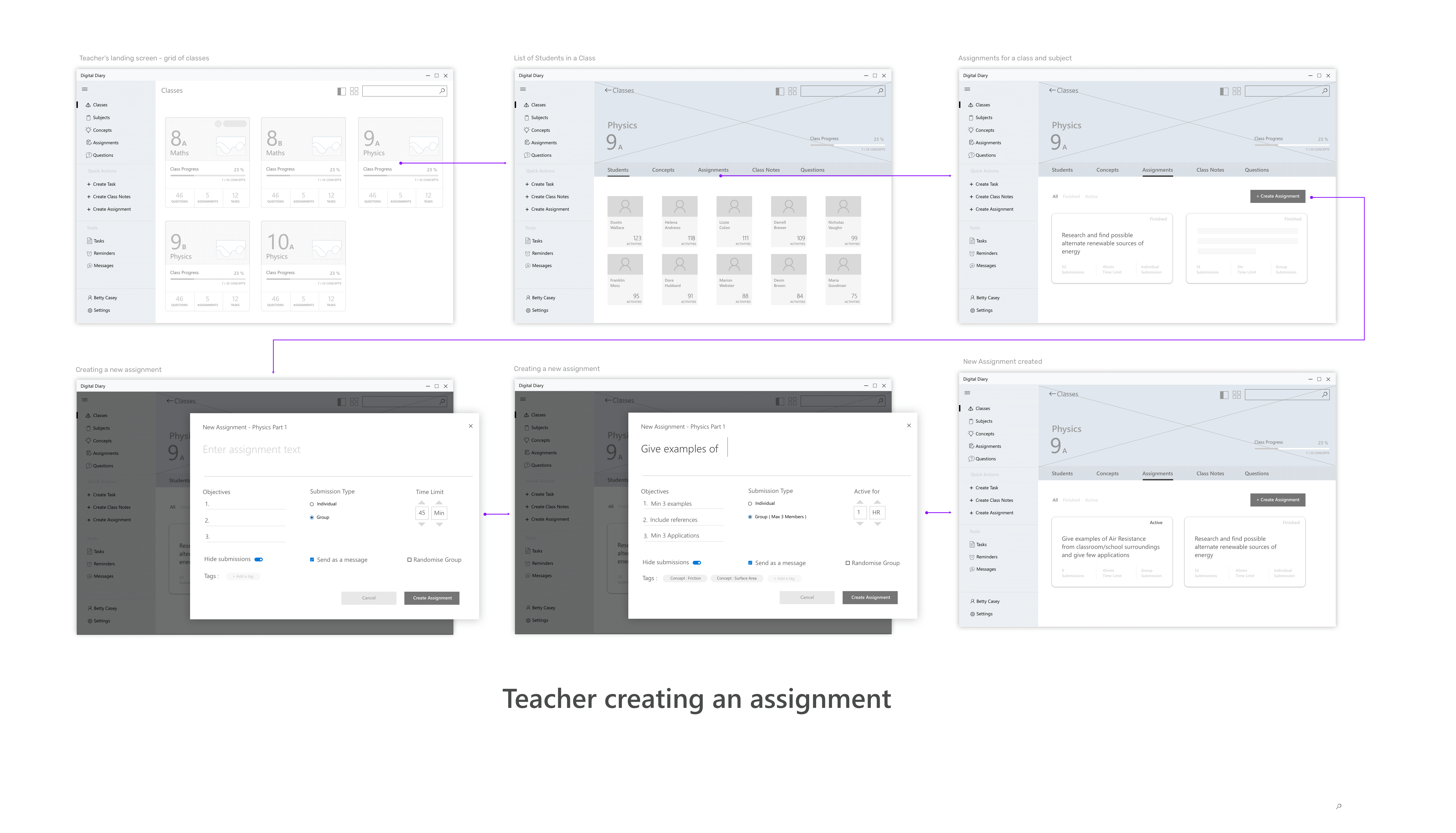 Wireframes for the scenario - Teacher giving an assignment to class