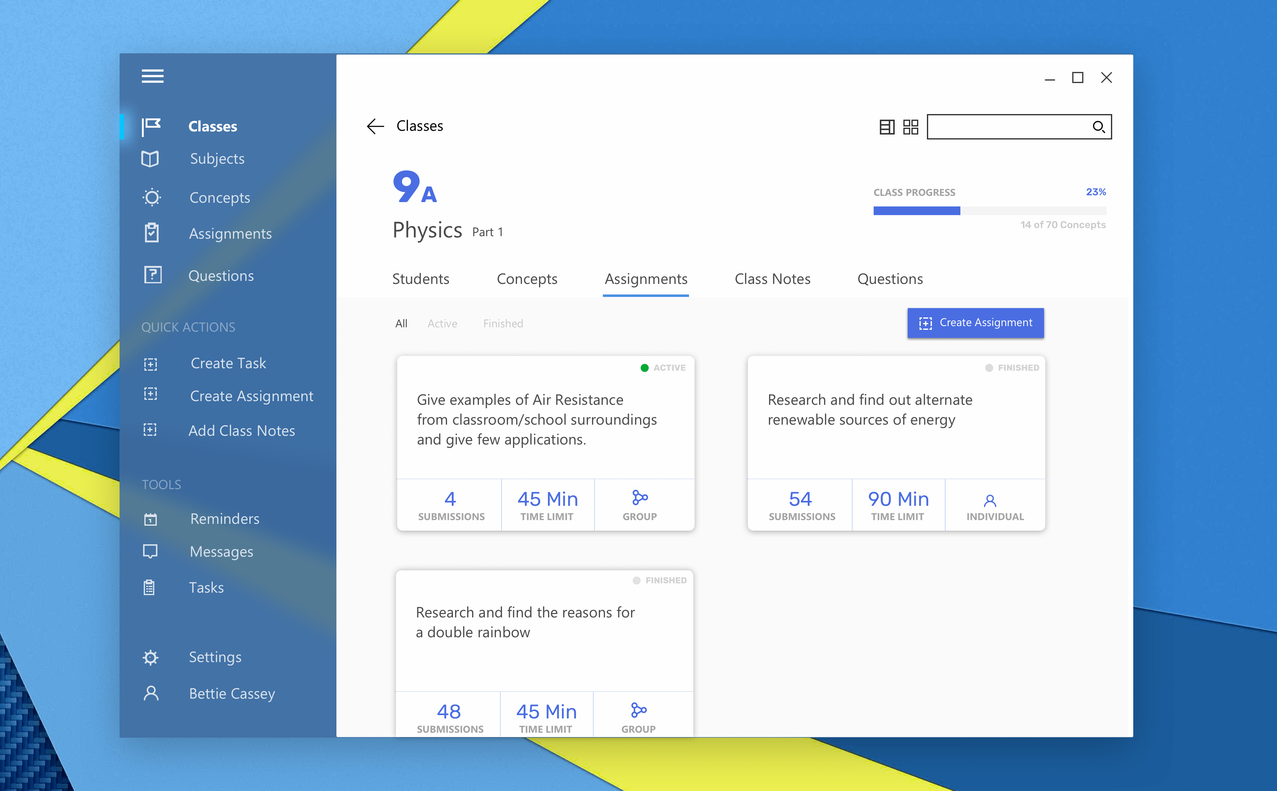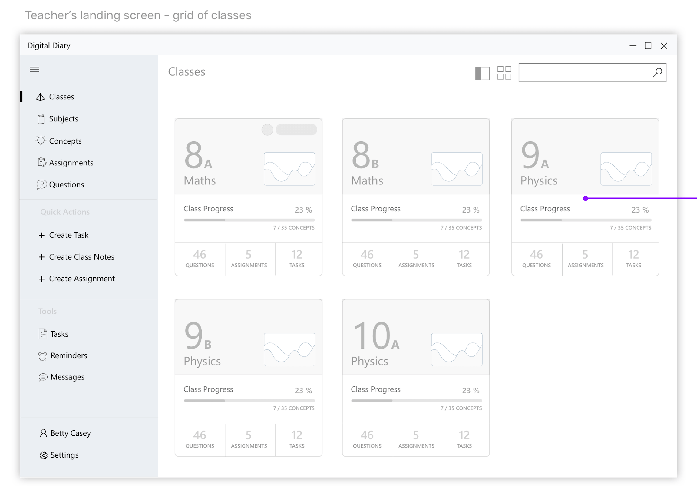 Teacher lands on the classes screen of the platform after logging in. Each “Class-Card” as a progress of how many concepts are taught. I wanted this software to help teachers equally to manage their everyday activites along with students.