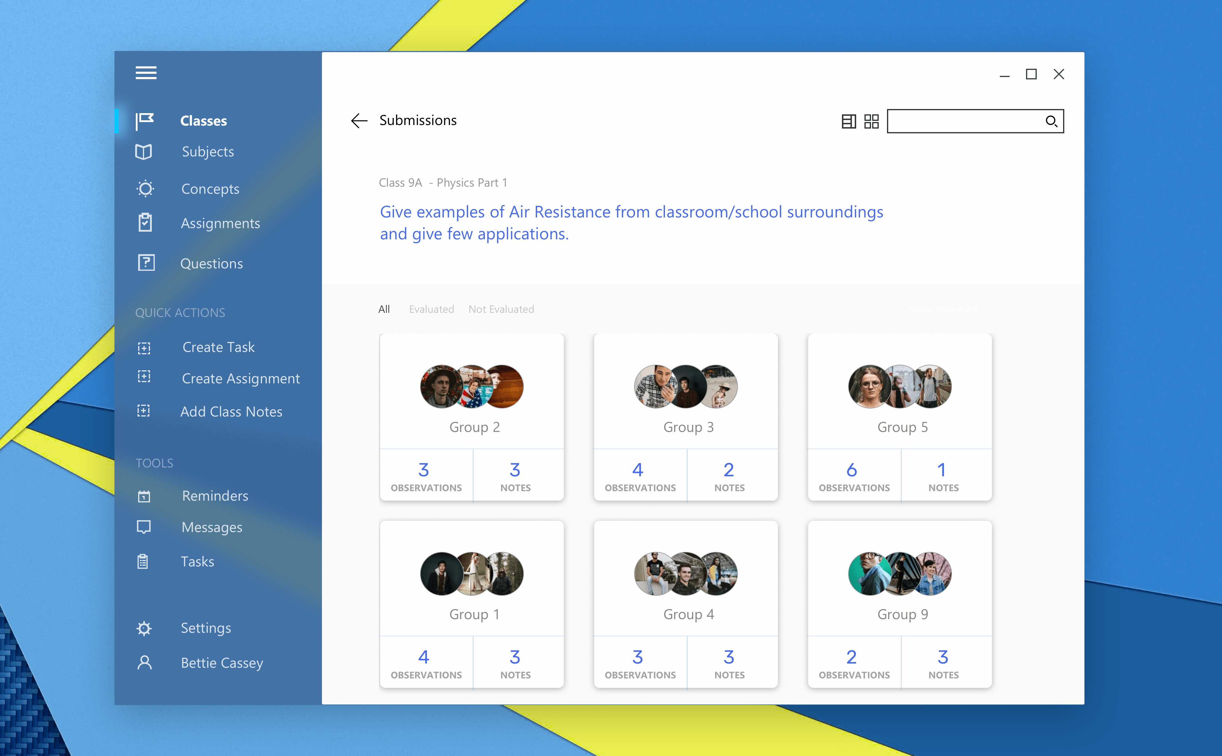 The teacher can view the various content submitted by each individual member of the group. Also, the teacher can “Check” if the required objectives are met and personalized evaluation criteria. However, teacher can view each entry and evaluate separately.