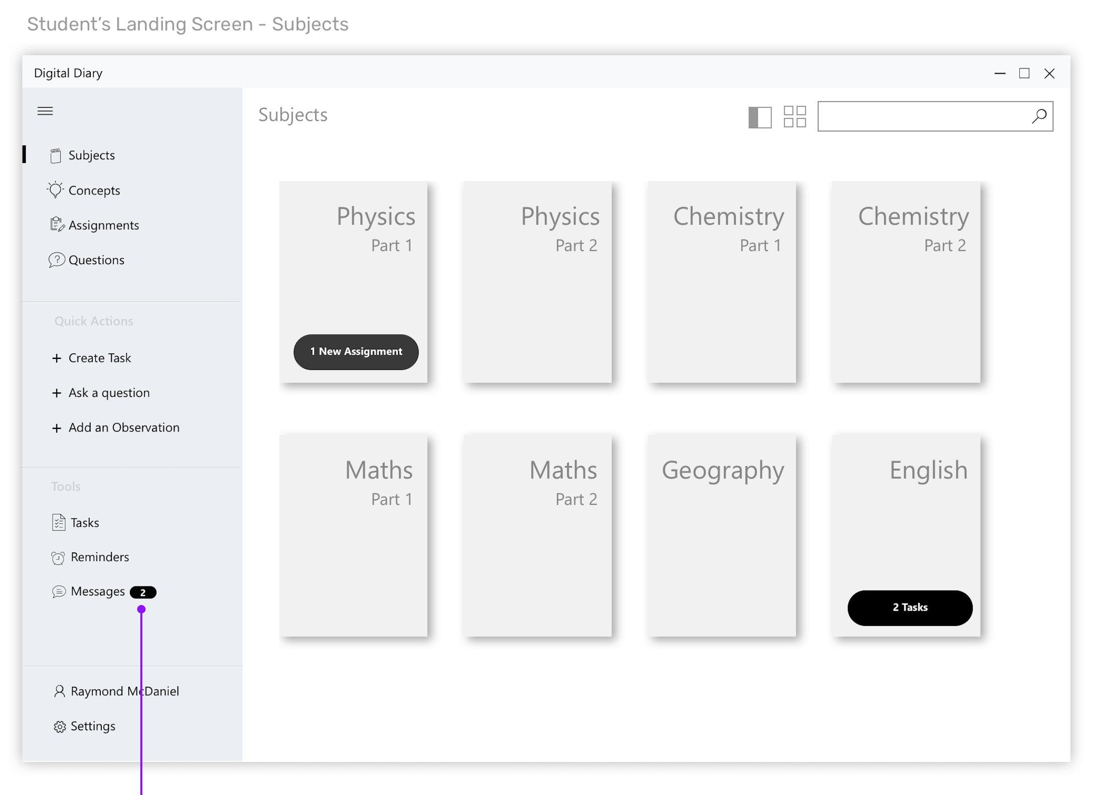 Students login and land on the Subjects page. They can select a subject and view the assignments. Also there is a notification for any new assignments.