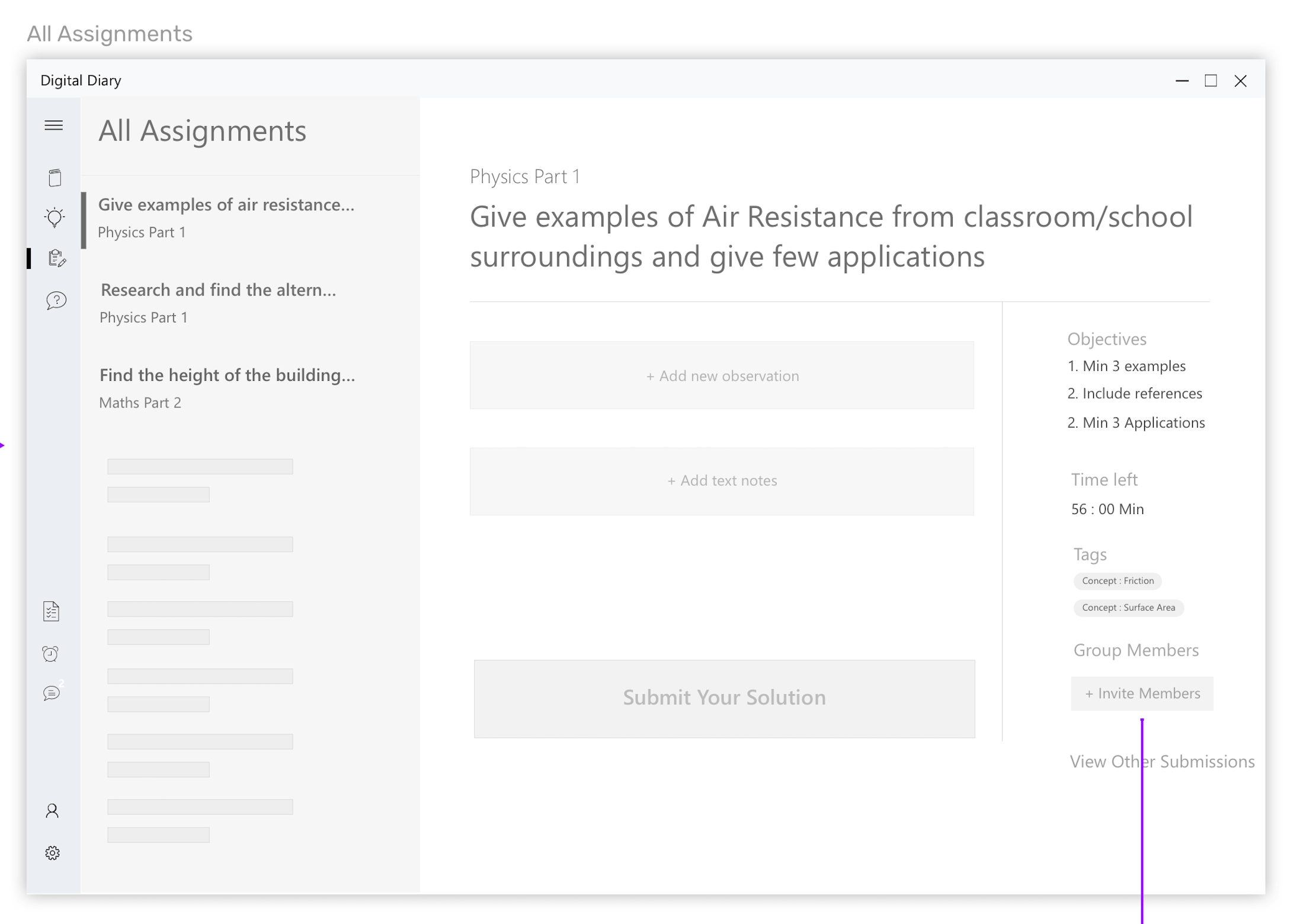 From here, student can invite others to work on the assignment View other’s submissions, or start working.