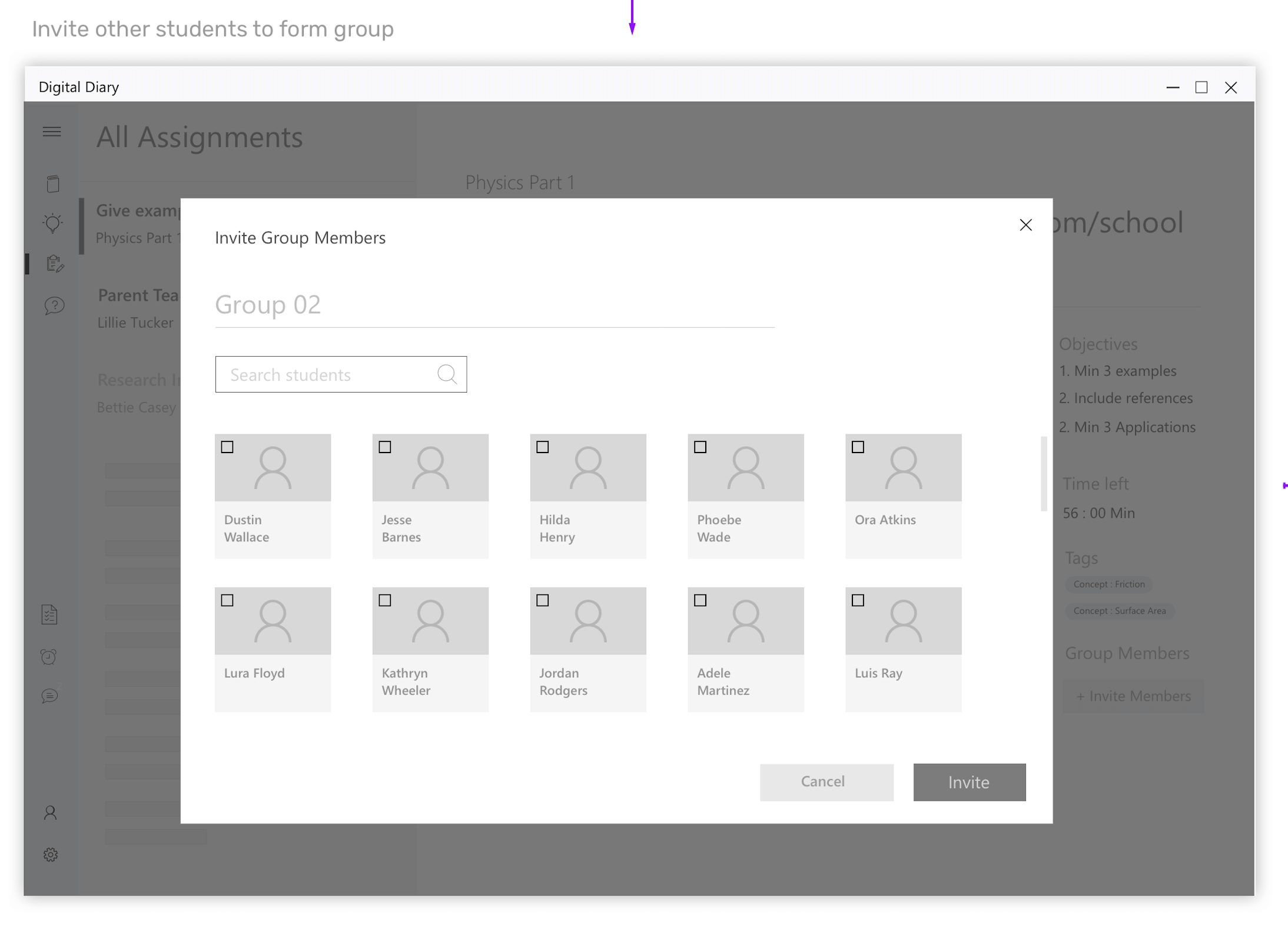 The students wanted to work on the assignment in a group and invite 2 more members to participate with him/her. On the list to choose members, we can eliminate those who have already formed groups.