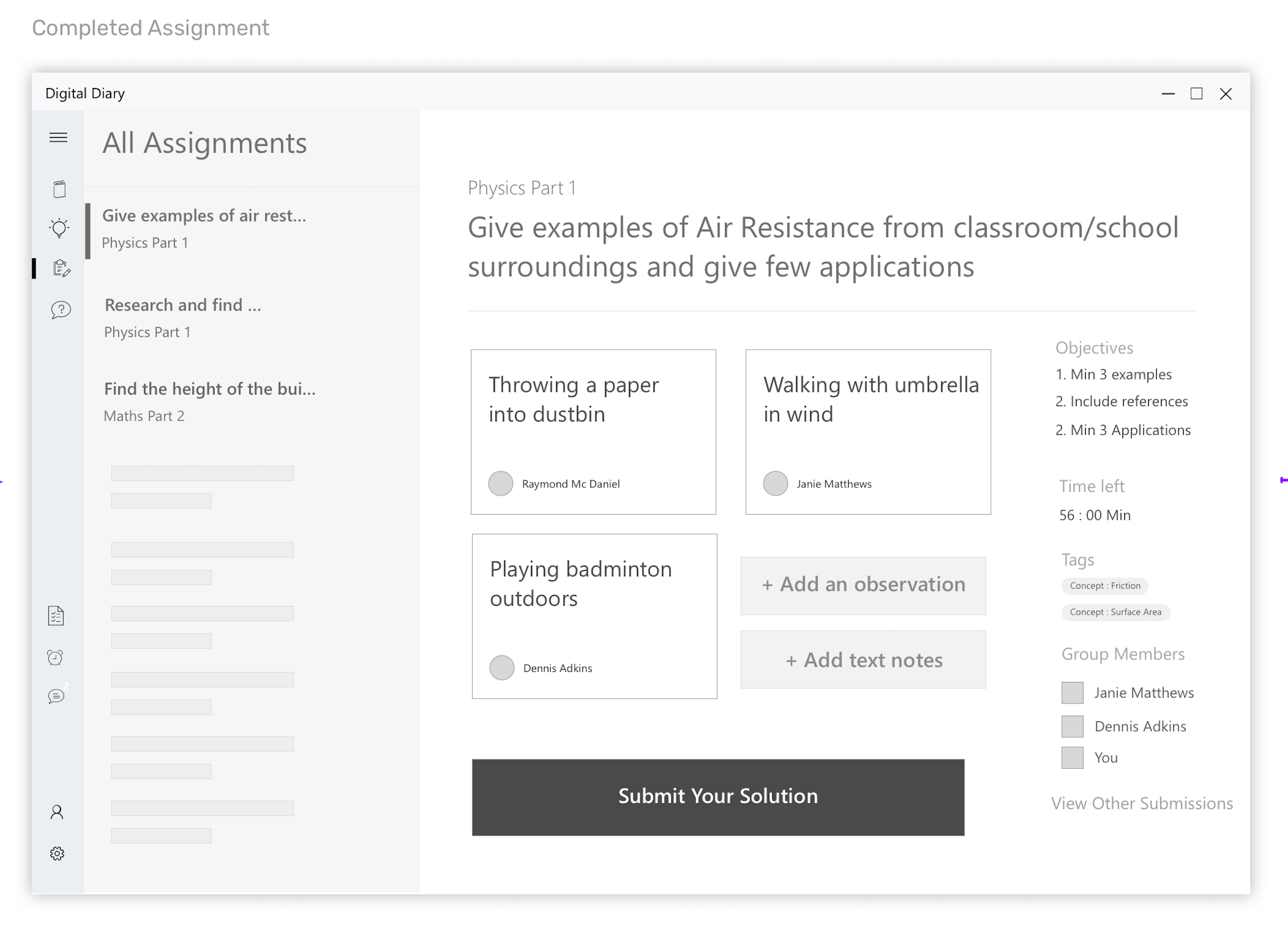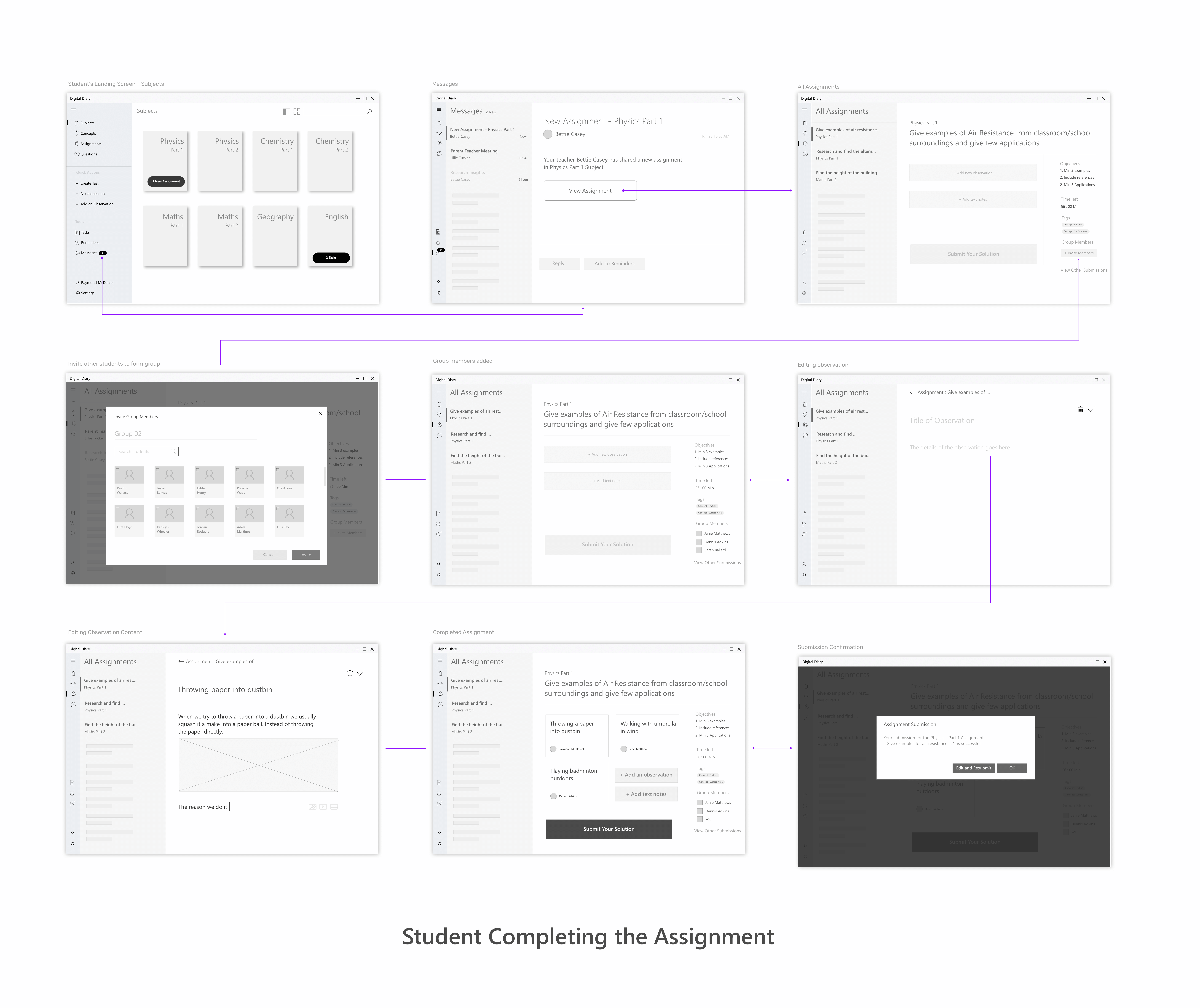 Wireframes for the scenario - Students completing the assignment