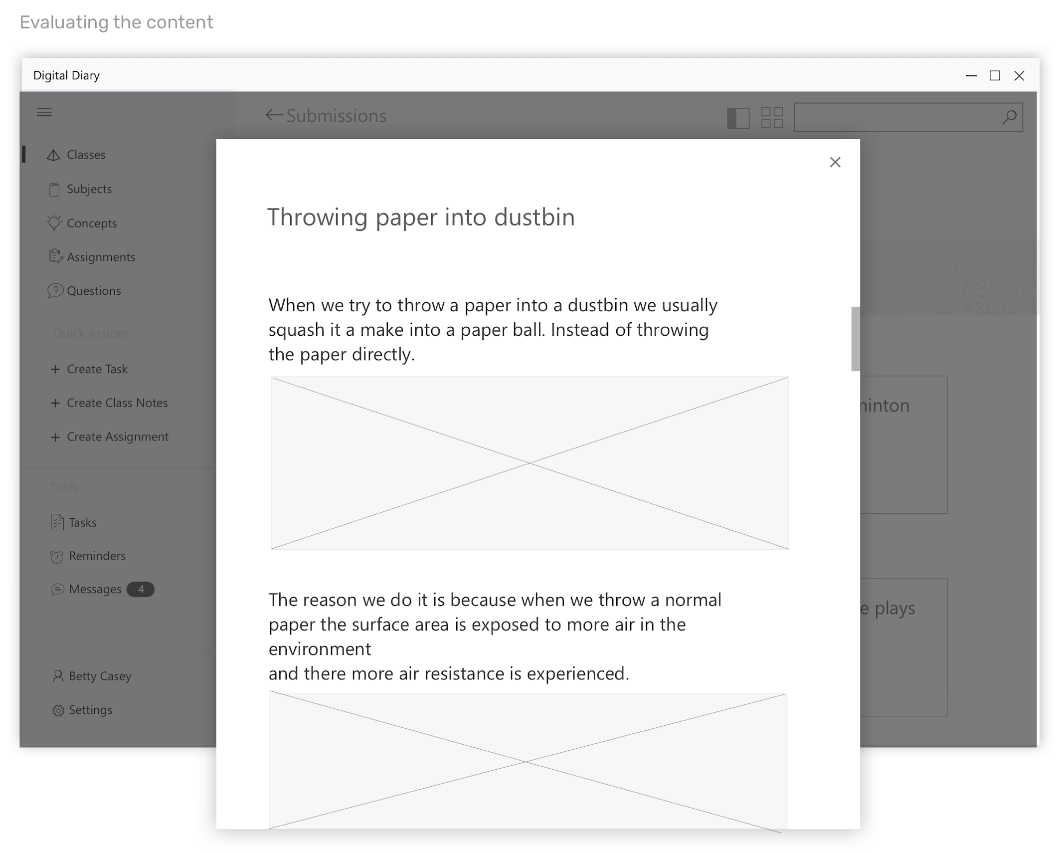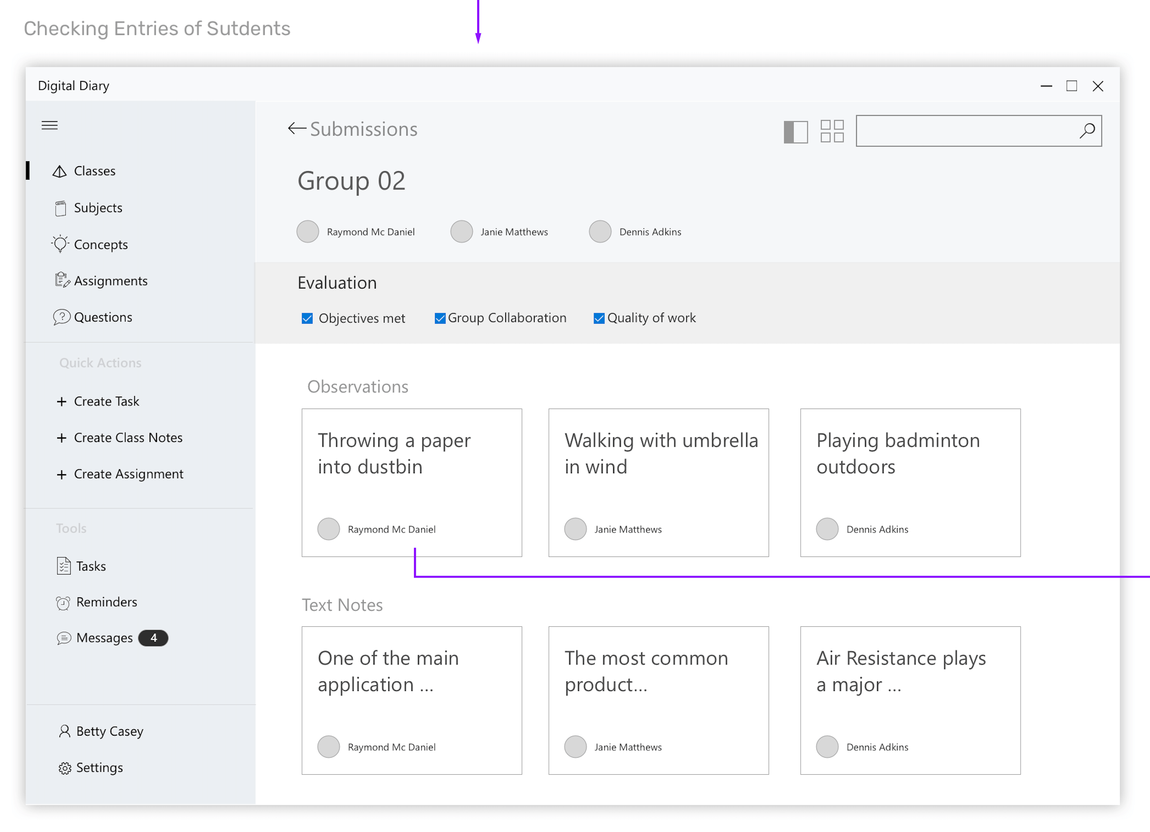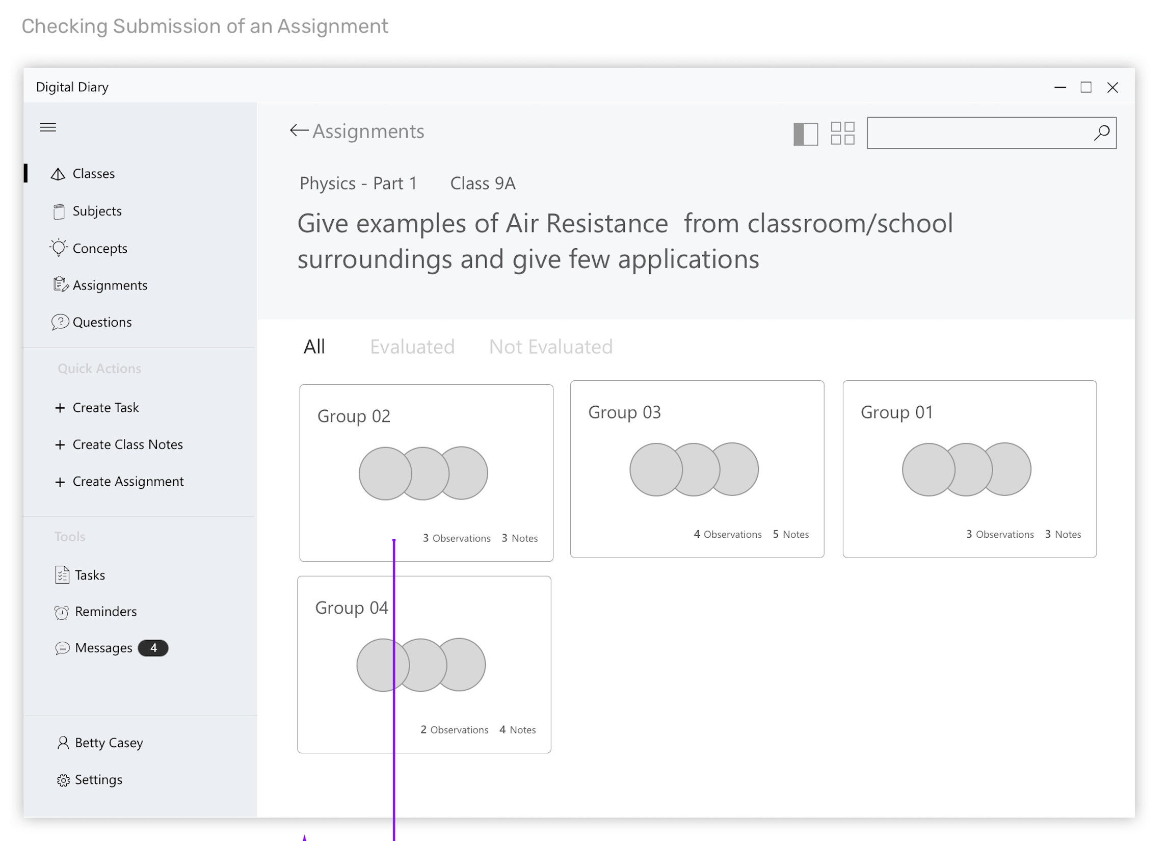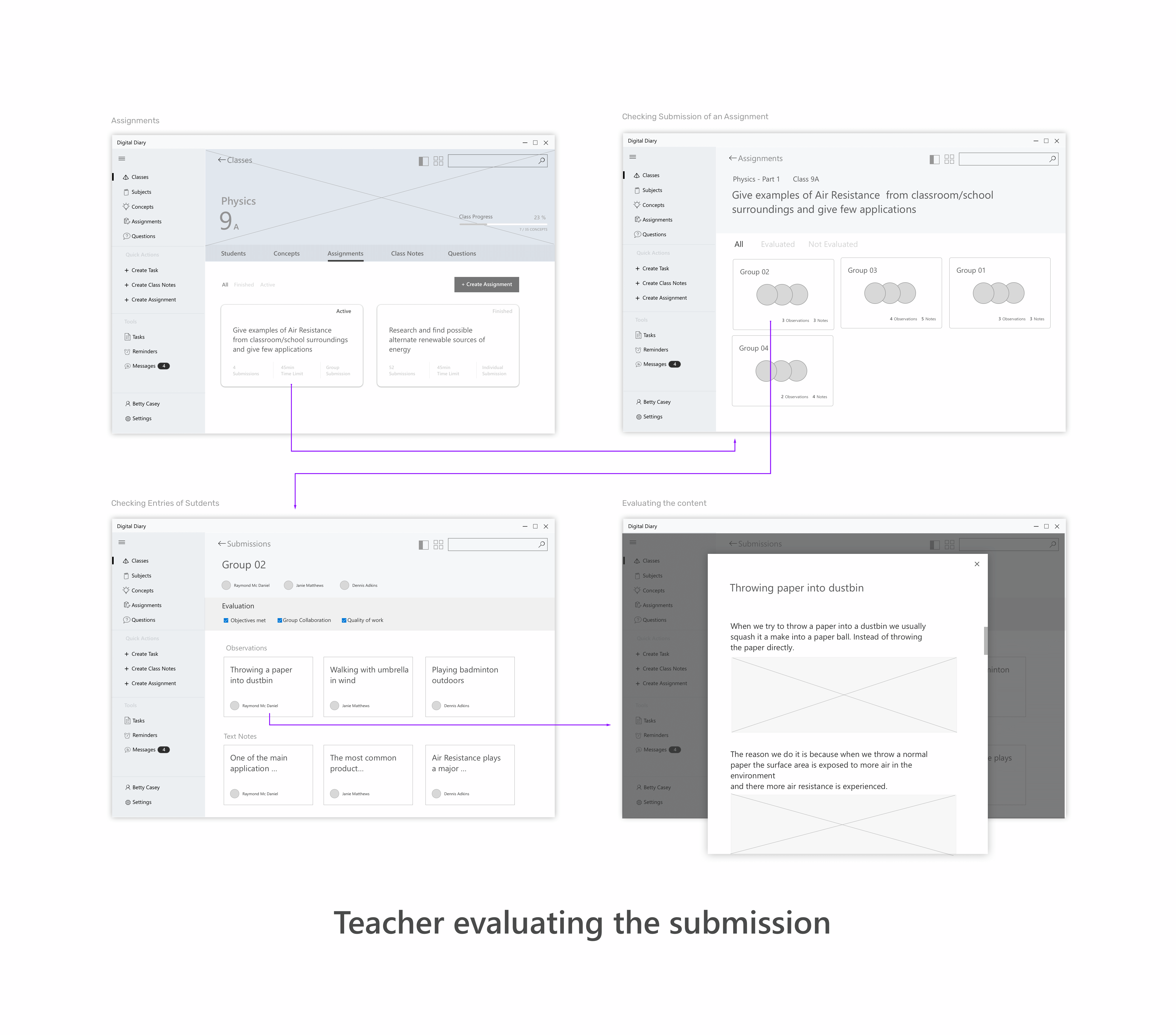 Wireframes for the scenario - Teacher evaluating the assignment