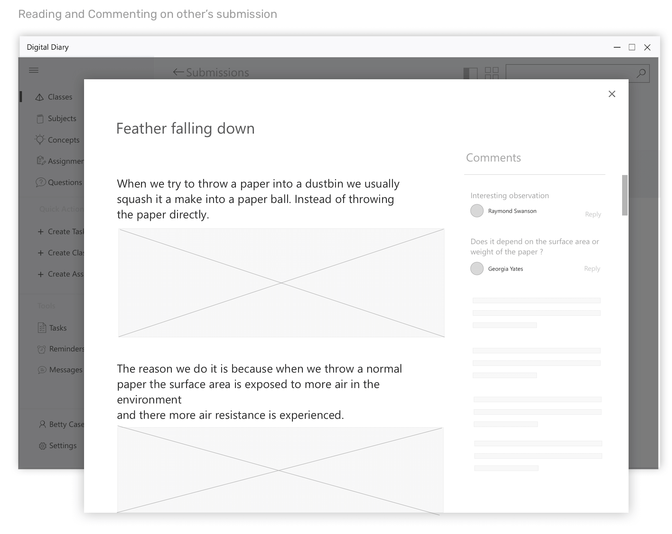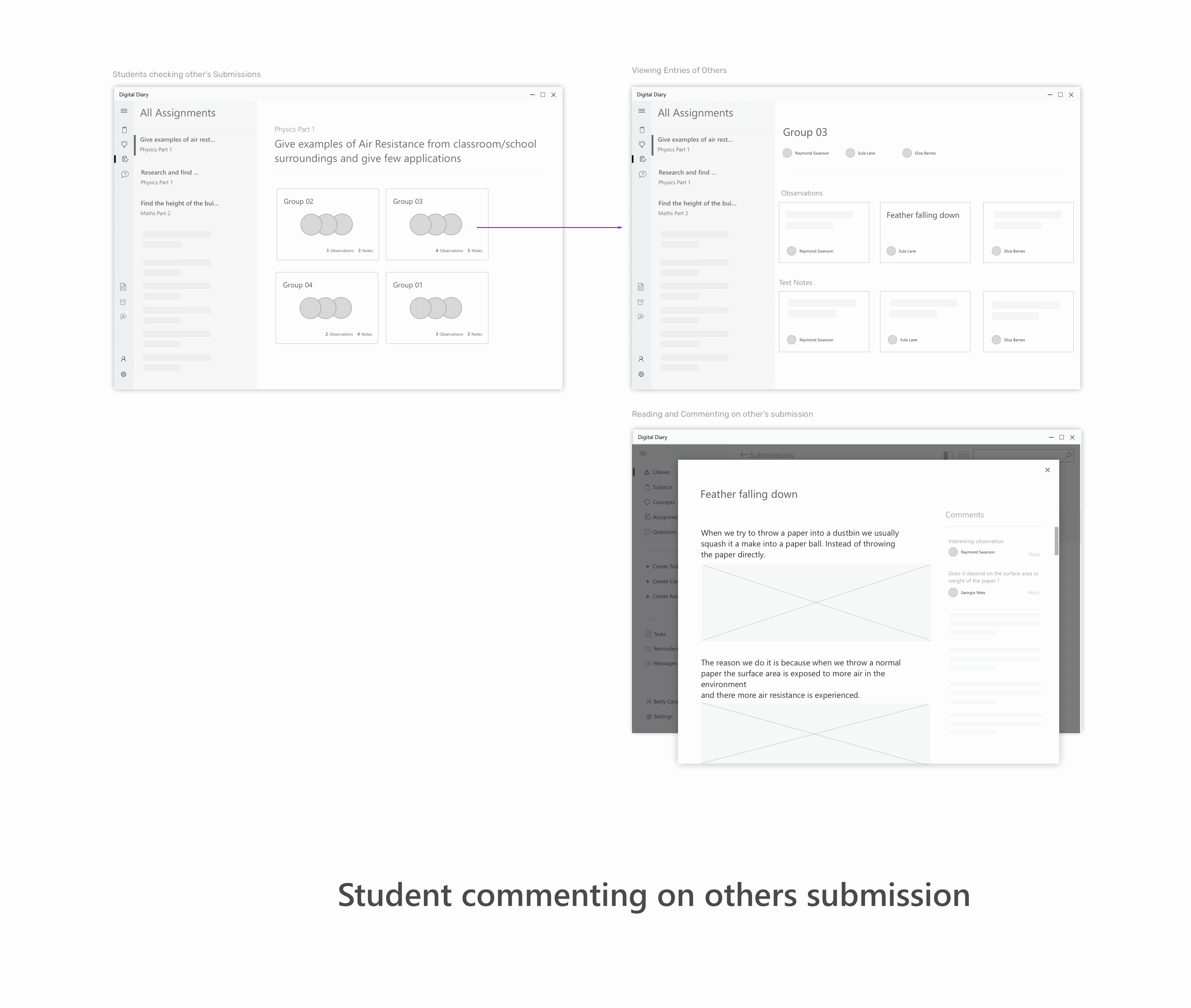 Wireframes for the scenario - Students commenting on each other's submissions