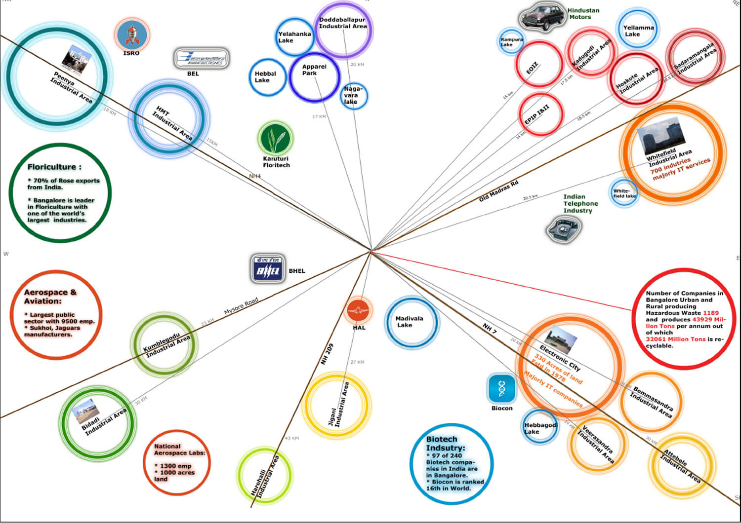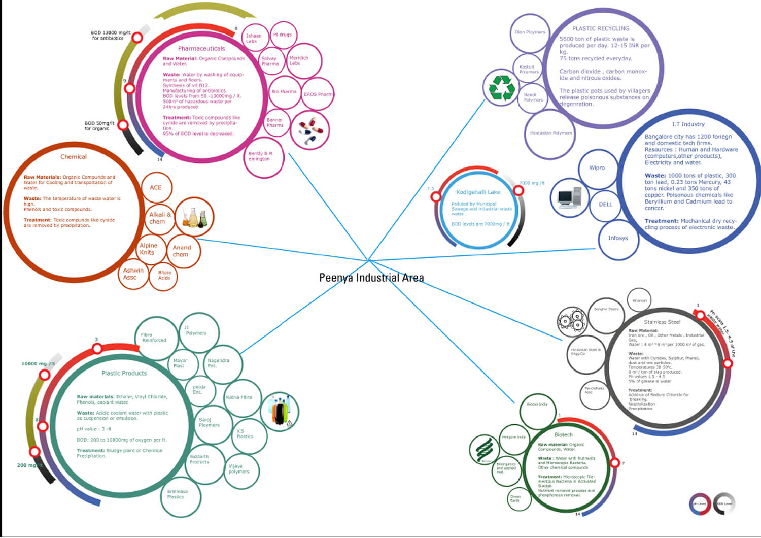 As part of academic project, I teamed up with my fellow students to conduct a deep qualitative research on the Industrial Ecology and produce a visualization that depicts the size of the industrial zones in and around Bangalore, the type of industry, no.of major lakes found near the zone, the health of the lakes, with parameters like the 'Biological Demand', the type of pollutants released into the lakes.