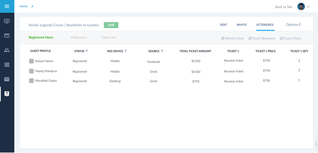 Attendees Listing screen