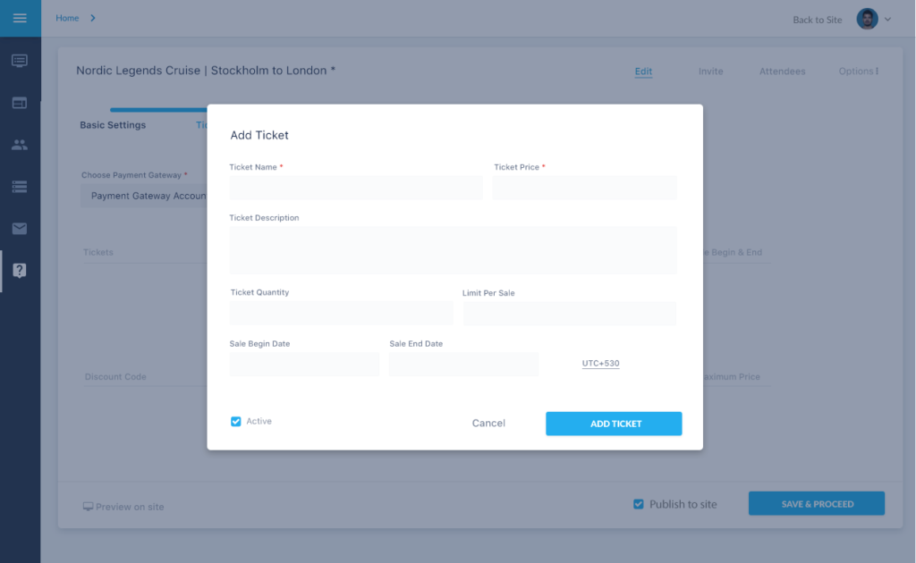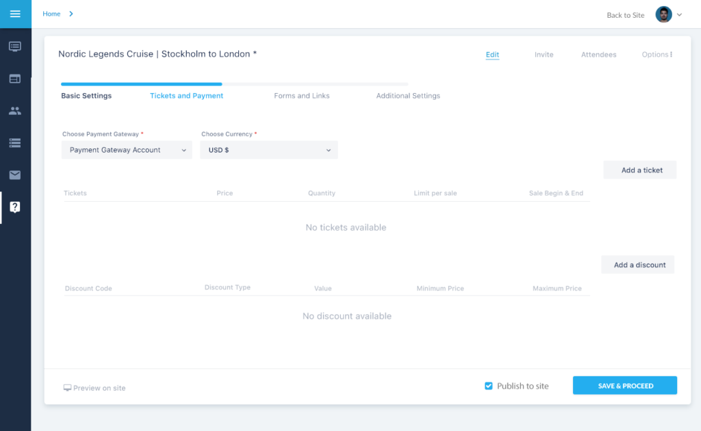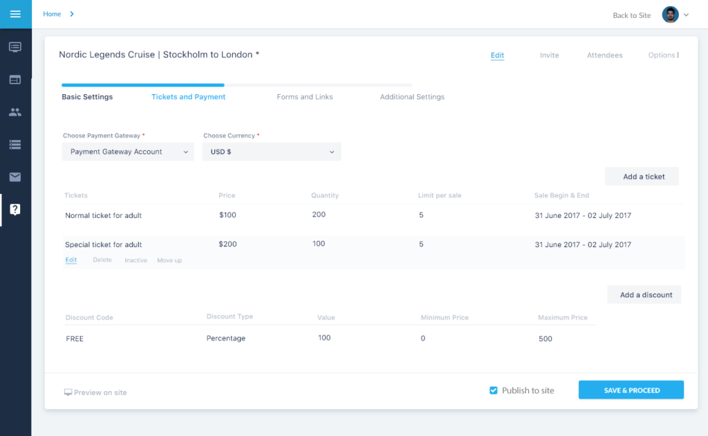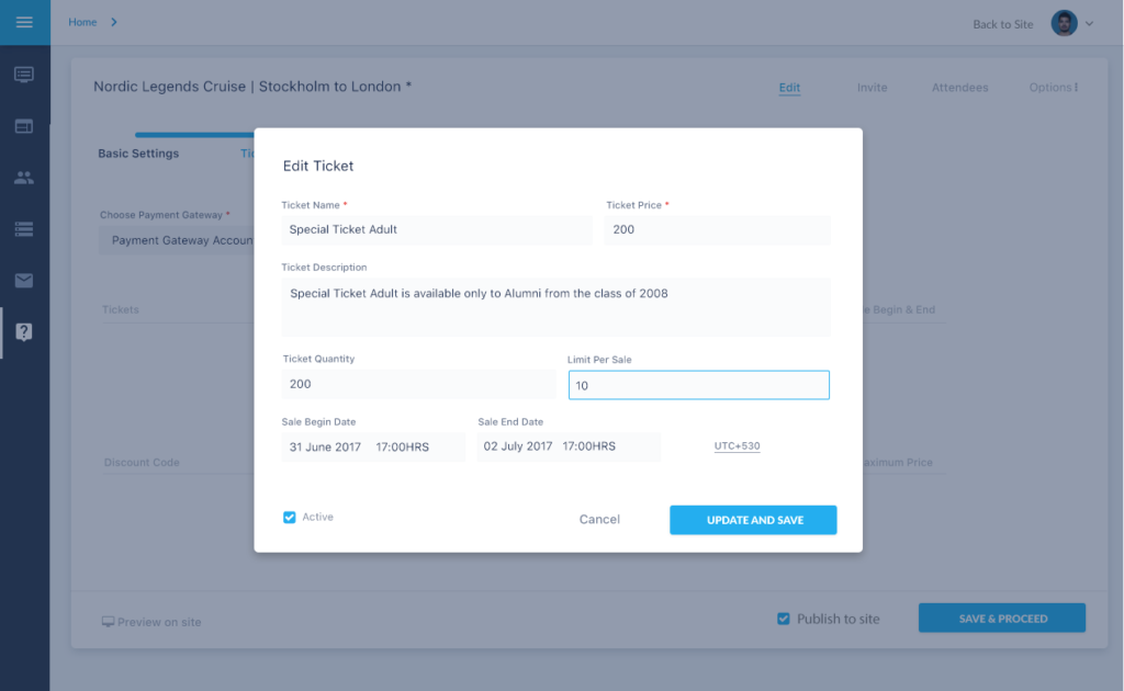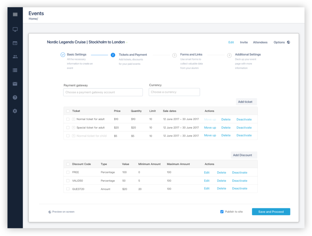 The Second Step captures the Tickets, Discount, and Payment Gateway details, the third step Alumni Officers can acquire more information from the alumni by including forms. In the last step, they can give more details regarding the event like agenda, directions etc.