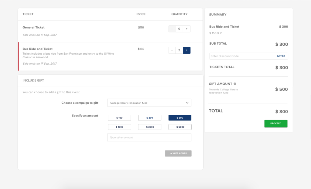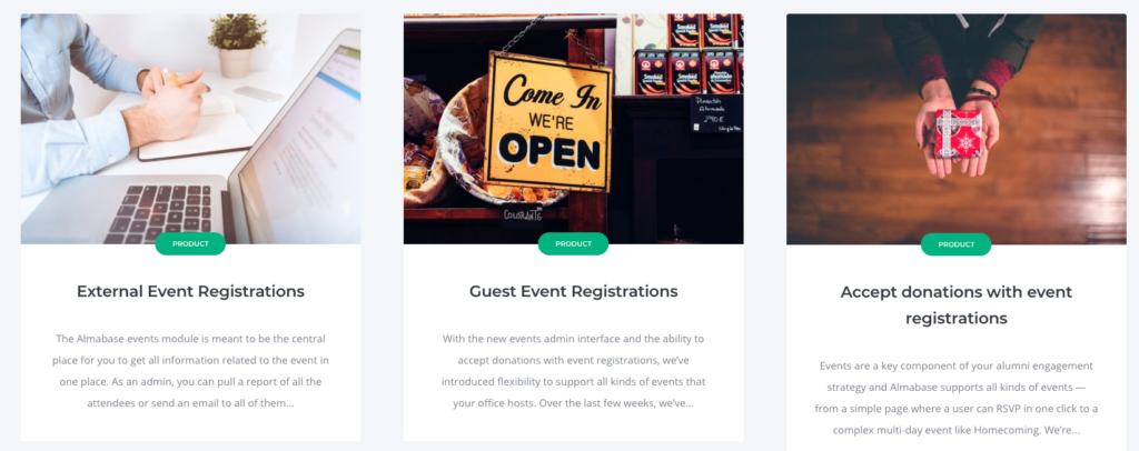 - Alumni can also donate or give gifts to a cause as part of the event registration flow.