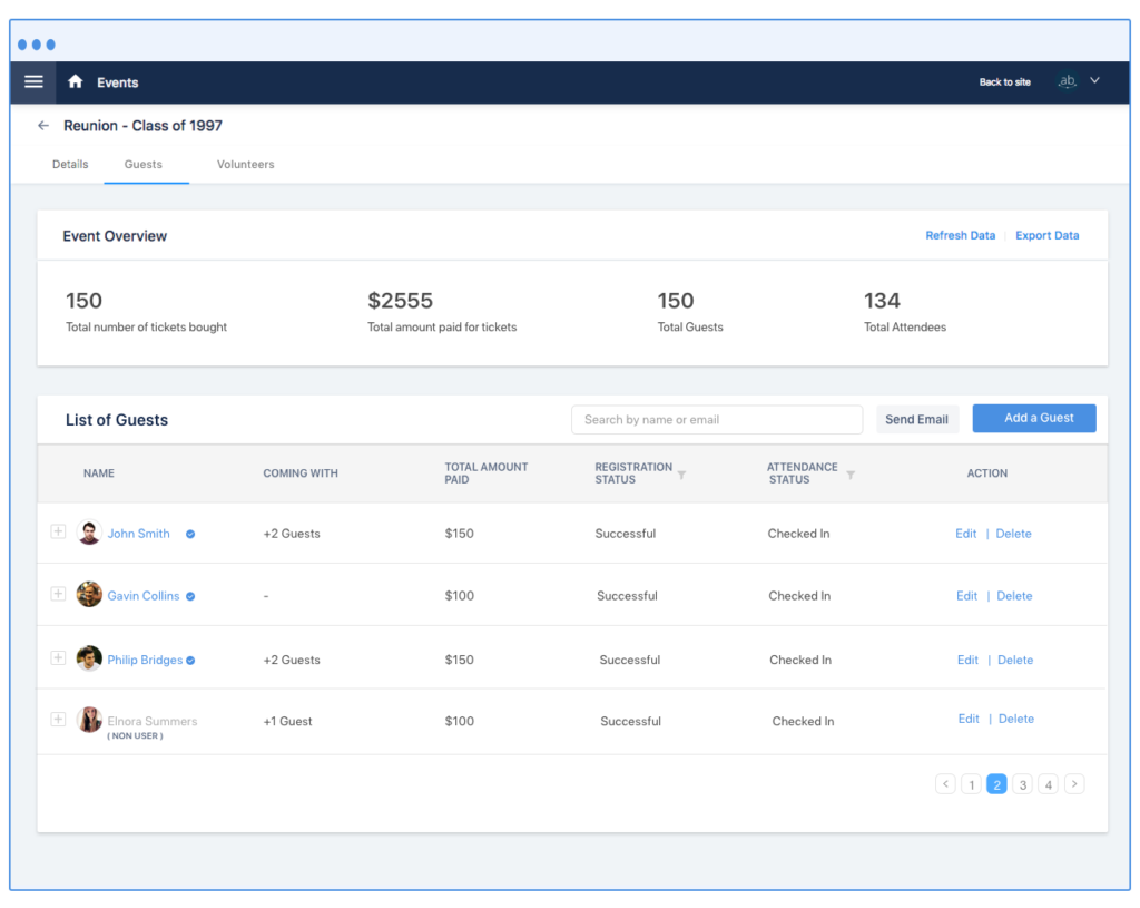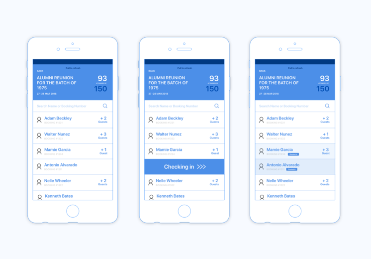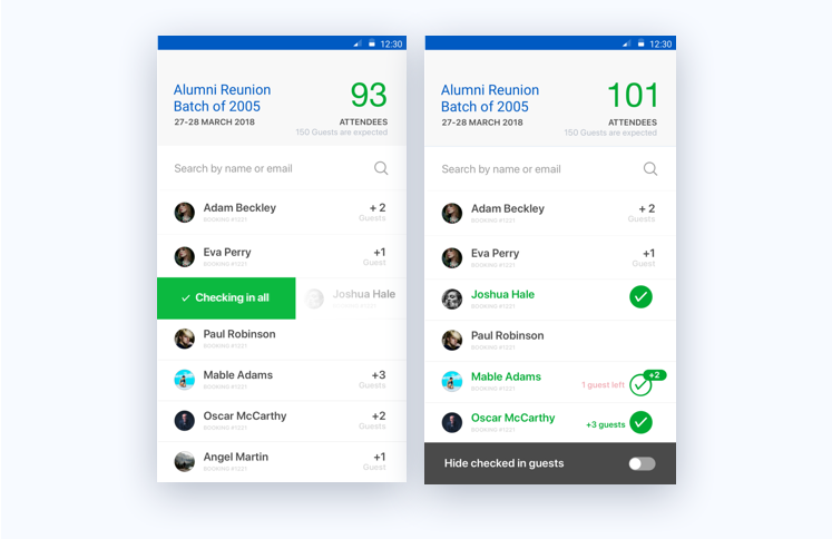 For event check-in, volunteers access a mobile device to search through the guests and mark them as checked-in.
