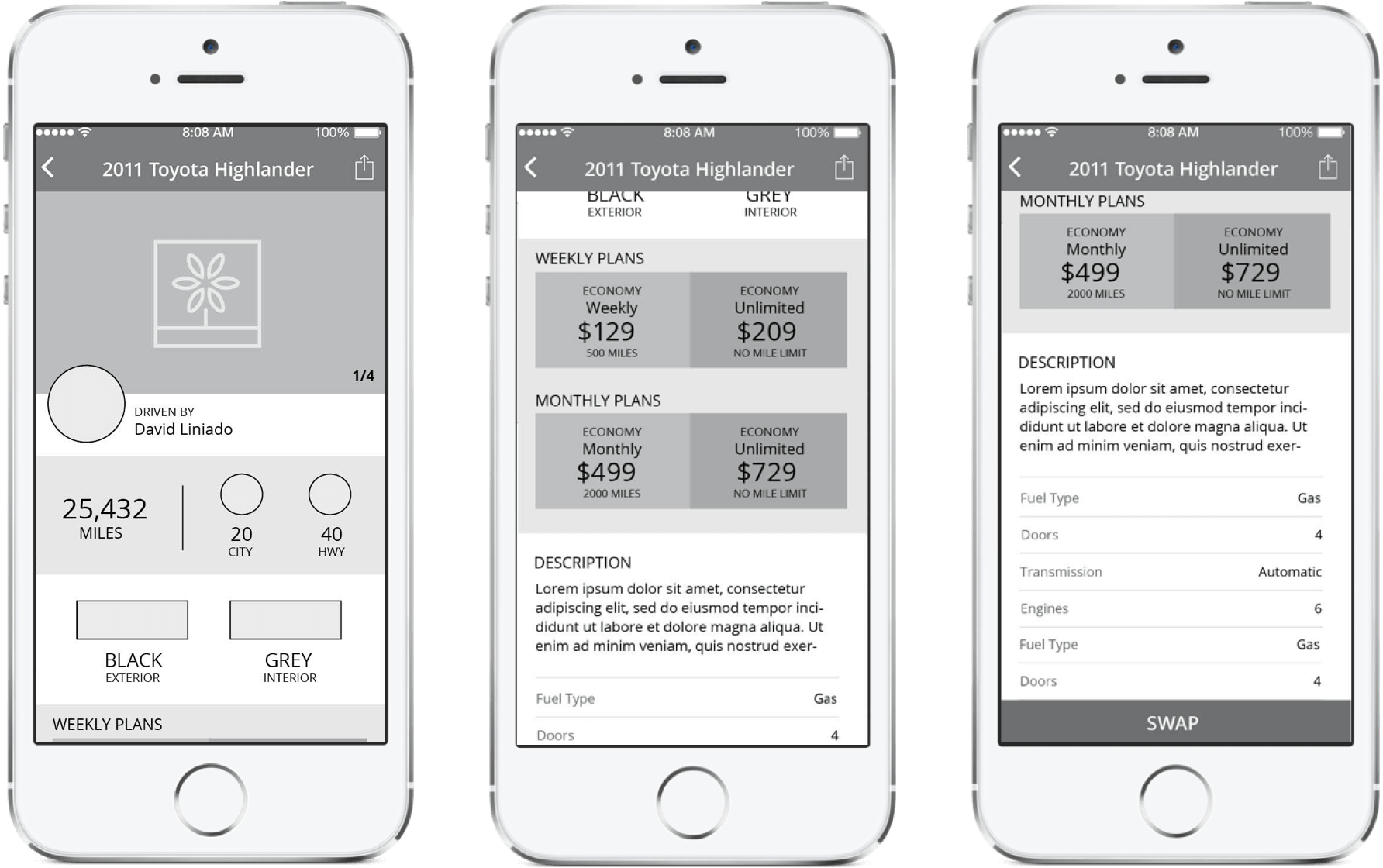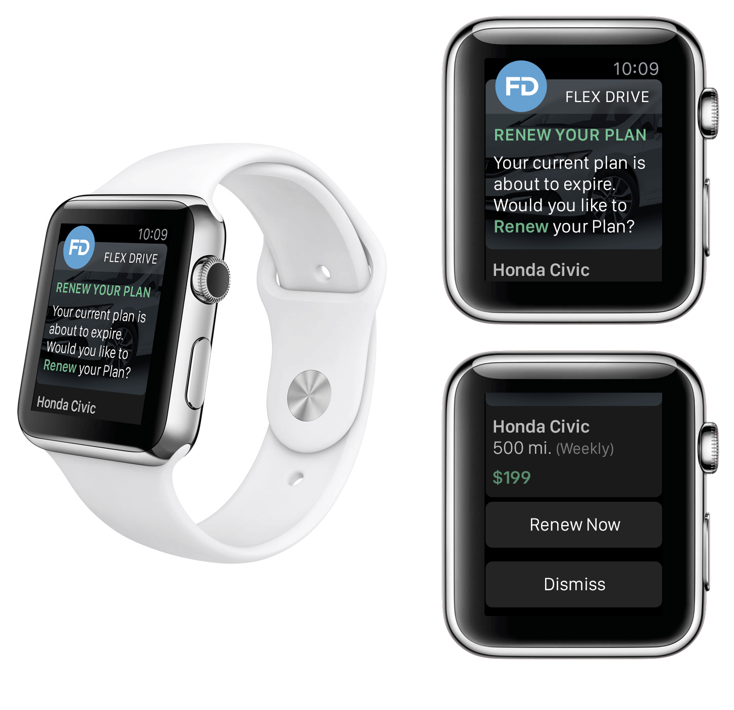 Every Flex Drive customer subscribes for a Plan , which is either Monthly or Weekly. Each Plan is assigned a Mileage of 2000 Miles or 500 Miles respectively for that particular period. Whenever the user reaches towards the end of the plan, a renewal notice is pushed. The user can check the notification, scroll through the brief details of the plan and tap to Renew on the go. User can dismiss the notification and take a decision later. User can also swap the current vehicle with another member.
