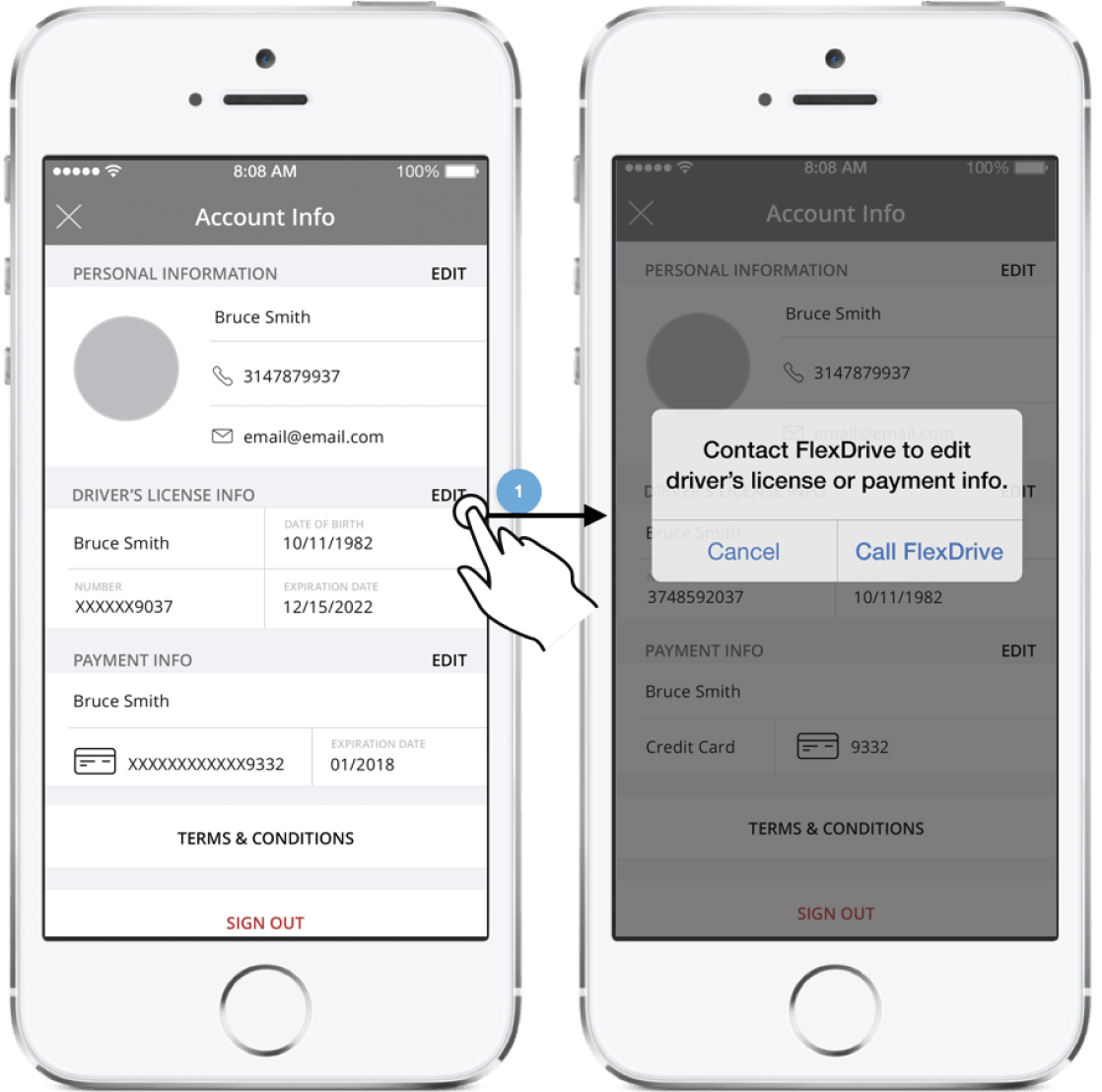 driver's license information, payment method and signout .