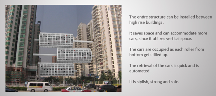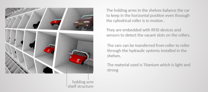 shelves to hold cars. The cars gets placed in each roller starting from ground level.