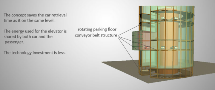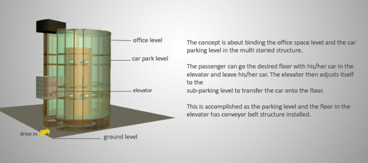 This concept aims at saving space by placing the cars around the office space. In heavily urbanised cities